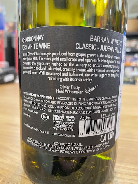 Barkan Classic Chardonnay száraz fehérbor a Barkan Pincészettől. A bor a Judeai-hegységben termesztett szőlőből készül Izraelben, kóser és mevushal minősítéssel rendelkezik.