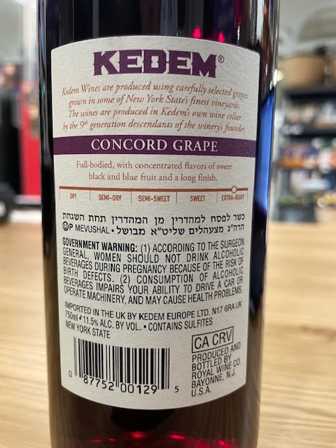 Kedem Concord Grape nevű, természetesen édes, kóser vörösbor, amelyet a New York állambeli Concord szőlőből állítanak elő. A bort a Royal Wine Co. palackozza Bayonne-ban, New Jersey államban, és az Egyesült Királyságba a Kedem Europe Ltd. importálja.